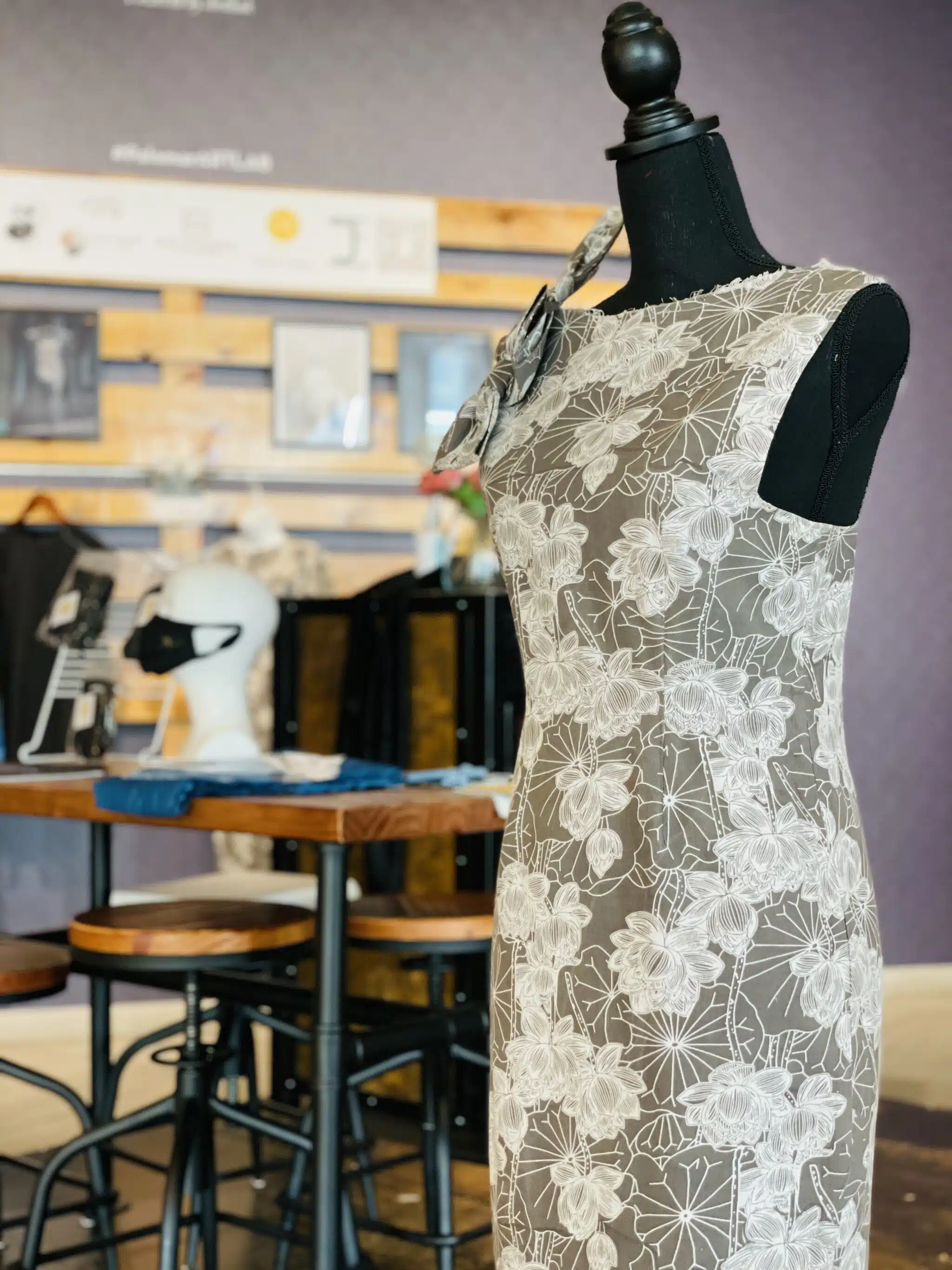 The piece on view in Greater Phoenix Economic Council’s Color, Cloth & Culture exhibit is the SWIYYAH Gabbi dress, a handmade garment constructed entirely from biodegradable materials by Jadestorm and the SWIYYAH textile team. Its origins trace back to a commission from the Herberger Theater, where SWIYYAH was invited to produce a plant-based fashion show for a private event. The dress itself was inspired by a design Jadestorm saw on Sex and the City and was first worn publicly by a young woman named Gabriella during pre-orders at the event. It is a garment with a story already stitched into it.